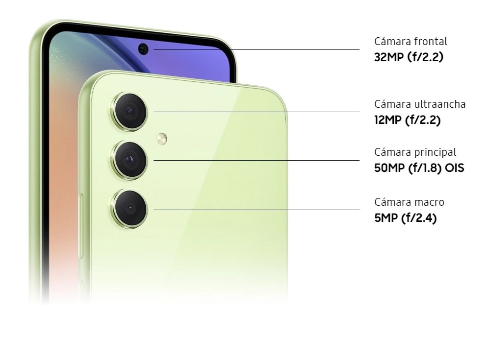 El Galaxy A54 combina una cámara principal de 50 MP con OIS, una ultraancha de 12 MP y una macro de 5 MP para capturar desde paisajes amplios hasta detalles cercanos. Su cámara frontal de 32 MP asegura selfies nítidas y llenas de color.